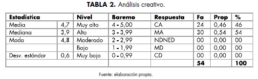 Respecto a la creatividad (tabla 2), existe una marcada tendencia, en la que el 100% de los encuestados manifiesta estar completamente de acuerdo o medianamente de acuerdo. Por otra parte, se observa que los promedios alcanzados se ubicaron en un nivel muy alto para la media, con un valor de 4,7; así, la mediana fue de 3,9, subrayando que la moda alcanzó un valor de 4,8. Respecto a la dispersión, se percibió que la desviación estándar fue de 0,6, siendo muy baja.