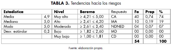 En este sentido, la tendencia hacia los riesgos está en un nivel muy alto, se perfila en un rango de ≥ 4,2 ≤ 5,0. En cuanto a la desviación estándar, refiere un valor de 0,3, lo cual indica que el aspecto no tuvo ningún cambio de posición. En ese contexto, se deduce que el elemento está presente en las acciones diarias de los emprendedores participantes en el estudio, lo cual permite concluir que el emprendedor que asume riesgos tiene la posibilidad y alternativa para mejorar y perfeccionar los procesos y acciones que lo llevan a ser más competitivo y productivo en las comunidades (Paz et al., 2015; Paz et al., 2020; Pedraza et al., 2017).