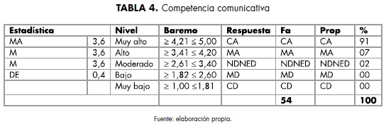 En lo referente a la competencia comunicativa (tabla 4), se encontró que el 99% de la población consideró estar completa y medianamente de acuerdo. Lo cual sugiere que los emprendedores deben ser habilidosos en esta línea de comunicación, indicando una tendencia de respuestas positivas. Por su parte, la media, la mediana y la moda adquirieron 3,6 en su valor, asociado al baremo de interpretación, que se ubicó en un nivel alto. Se generó un nivel de dispersión de 0,4, lo cual indica que la habilidad comunicativa del emprendedor se percibe como de tendencia moderada.