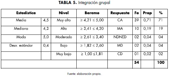 Otro elemento es la capacidad de integración grupal (tabla 5). Se destaca que el 90% de los encuestados manifestó estar de acuerdo, 4% respondió de forma neutral y el 2% estuvo completamente en desacuerdo. En este aspecto, el nivel alcanzado es muy alto, dado que la media obtuvo un valor de 4,5, la mediana 4,3 y la moda 5,0. Esto implica una dispersión de 0,4, destacando la importancia de este elemento en el perfil de los emprendedores.