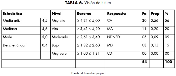 Finalmente, se muestran los resultados asociados al elemento visión de futuro (tabla 6)-. El 76% estuvo completa y medianamente de acuerdo, a diferencia del 15%, que manifestó estar medianamente en desacuerdo, y un 9% ni de acuerdo ni en desacuerdo. La media aritmética se ubicó en 4,5, la mediana en 4,6 y la moda en 5,0, considerando un nivel alto en cuanto a la presencia de este elemento en el perfil del emprendedor. También se observa una desviación estándar de 0,4, con un nivel alto en su dispersión.