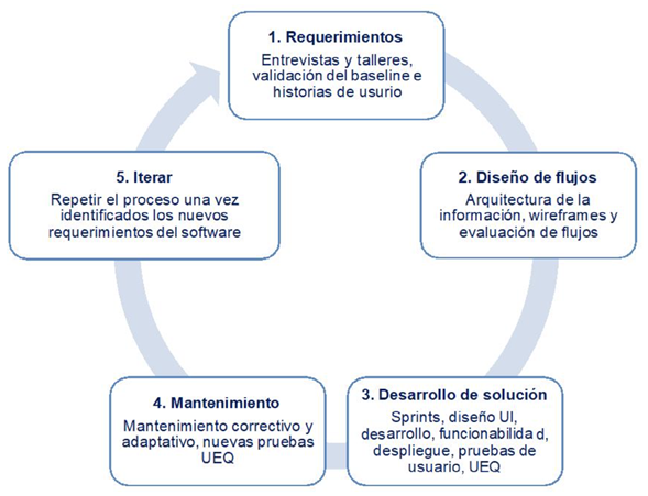 El flujo de proceso de desarrollo de software consta de varias etapas (Figura 2), en las cuales se abordaron diferentes aspectos para mejorar la experiencia de usuario de la empresa. Este proceso consta de las siguientes cinco fases, lo