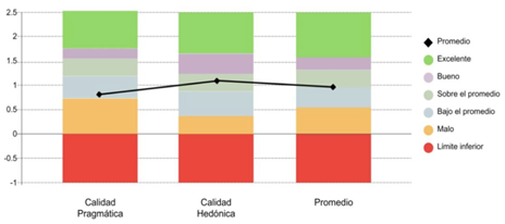 Para interpretar los datos de la Tabla 4, es importante tener en cuenta que, en tanto en la calidad pragmática y la calidad hedónica, los valores negativos indican una mala percepción, los positivos una favorable y los cercanos a cero indican una percepción neutra o mixta. En cuanto a la calidad global, los valores cercanos a 1 indican una perspectiva positiva, mientras que los valores por encima de 1 indican una percepción aún más positiva. Por otra parte, los valores por debajo de 1 sugieren una percepción un poco mediocre y en casos en los que los valores tienden a 0, pueden indicar una percepción muy negativa de la calidad global del producto, lo que indica que el software tiene serios problemas de usabilidad.