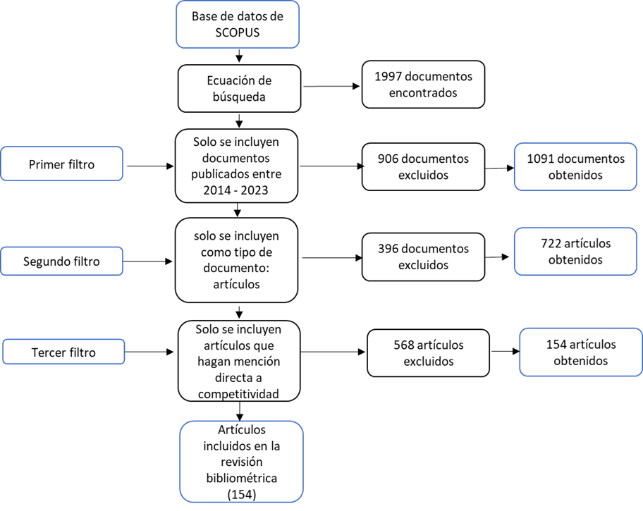 Los resultados obtenidos se refinaron aplicando tres filtros (Figura 1). En el primero solo se incluyeron los documentos publicados entre 2014 y 2023, se obtuvieron 1091 y se excluyeron 906. En el segundo filtro se consideraron solo artículos, se obtuvieron 722 y se excluyeron 396. En el tercero solo se tuvieron en cuenta artículos que hicieran mención directa a la competitividad, se excluyeron 568 y se obtuvieron 154. Con los documentos seleccionados se adelantó la revisión bibliométrica.