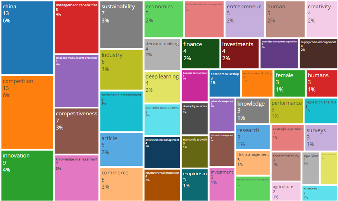 Finalmente, se hizo un análisis de co-ocurrencia de las palabras claves. Se tomó como parámetro mínimo tres ocurrencias. De 483 palabras solo 38 cumplieron esta condición, como se aprecia en la Figura 9, en la que se identifican cuatro clústeres. En la Figura 10 se destacan las palabras competition, China, innovation, management capabilities, competitiveness, knowledge management, sustainable development and enterprise resource management.