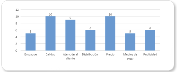 Los clientes evalúan los productos y servicios ofrecidos por las emprendedoras calificando de uno a diez atributos tales como el empaque, la calidad, la atención al cliente, la distribución, el precio, los medios de pago y la publicidad. En este sentido, ellos perciben como fortalezas el precio, el servicio al cliente y la calidad, ya que las emprendedoras se destacan por trabajar con materia prima que posee altos estándares, elaboran sus productos teniendo en cuenta la originalidad en los diseños y las preferencias de los consumidores. En cuanto a aspectos por mejorar, se identifica que el empaque no es óptimo para los productos entregados, los medios de pago están reducidos al efectivo y sólo algunas reciben pagos por Nequi, existe incumplimiento en las fechas de entrega pactadas, el acceso a la ubicación de los emprendimientos es difícil, ya que se encuentran en un barrio retirado del casco urbano, sus canales de distribución son deficientes, no poseen inventario ni capacidad instalada para producir grandes cantidades. En lo referente a los canales de comunicación, cuentan con herramientas como el teléfono y las redes sociales, logrando un acercamiento remoto con sus clientes. Se muestra la calificación atribuida a los productos o servicios ofrecidos por las emprendedoras (gráfica 3).