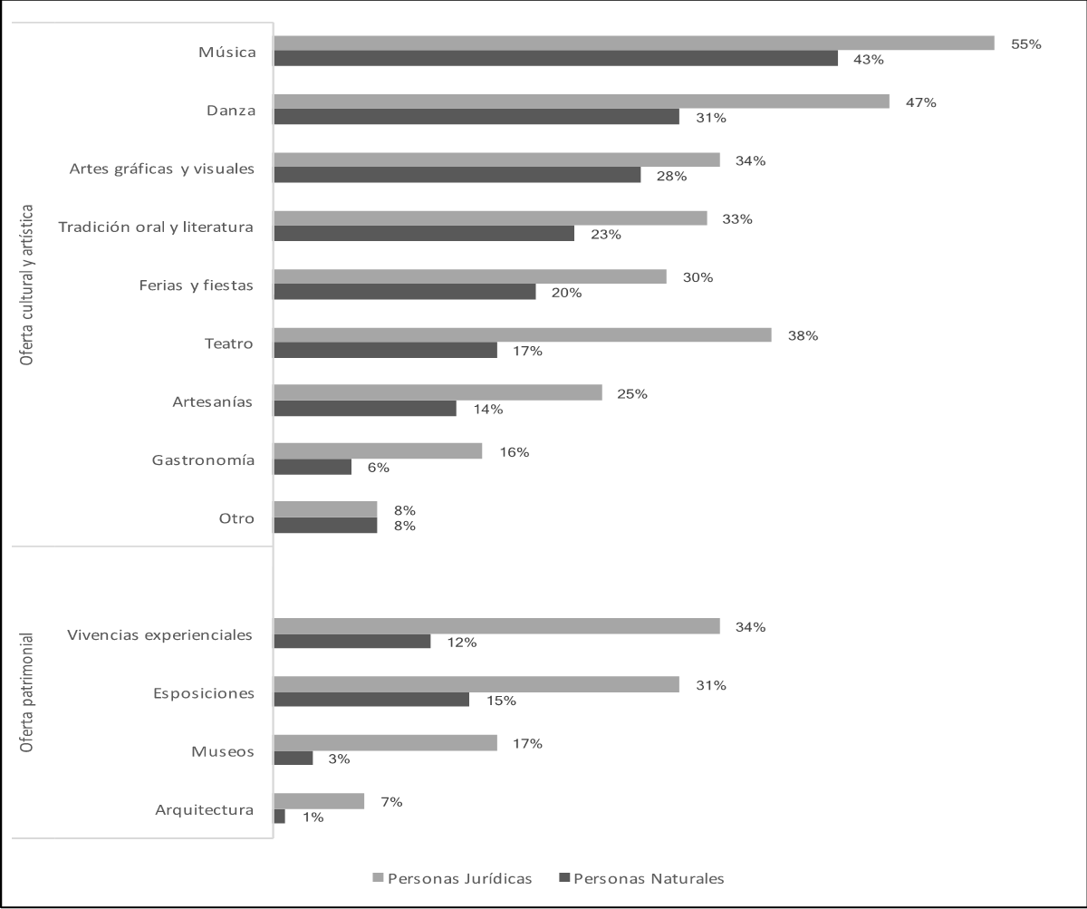As can be seen, legal entities have a greater cultural, artistic, and heritage offer than natural persons; however, the same trend is maintained, where music has become the most important cultural element in Quindío, followed by dance, graphic and visual arts, and oral tradition and literature. On a smaller scale, there are fairs and festivals, gastronomy, and crafts. However, in the theater there is a marked difference because the offer of legal entities is representative compared to natural persons. Thus, as in the article "Artistic communication model: the development of the performing arts through the empowerment of cultural tourism based on art" (Jaeni, 2023) the results argue that develop culture to create artistic products and tourist spaces based on cultural art to reach a model of communication of the performing arts. Regarding the heritage offer, the experiential experiences and fairs and exhibitions of NGOs stand out, observing a marked difference with respect to natural persons.