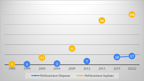 Al observar los datos recopilados, se logró evidenciar que estas dinámicas de investigación han tenido una evolución constante y creciente. En inglés, las primeras publicaciones relacionadas con las tres palabras claves de interés aparecieron en el año 1980, mientras que en español se dieron los primeros avances en artículos académicos hacia 1999. Aunque la producción científica es mucho menor que en inglés, se conserva un patrón creciente, lo que permite visualizar el interés de los autores e investigadores en temas que integran los procesos administrativos, el marketing y la cultura organizacional. Por esta razón, ahondar en esta línea de reflexión contribuye con la generación de conocimiento para favorecer la mejora continua de las pequeñas y medianas unidades productivas (pymes) (Fernandes et al., 2023).