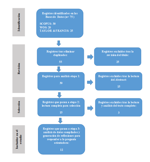 En el análisis documental se desarrolló una revisión sistemática exploratoria con el método PRISMA, que permitió recabar avances teóricos y aportes provenientes de bases de datos de corriente principal, como Scopus, Web of Sciencie y Taylor & Francis. Para seleccionar los documentos, artículos y publicaciones científicas se definieron criterios de inclusión acordes con el nivel de investigación. Según Franco y Solórzano (2020), definir criterios que acoten la investigación promueve la captación de información concreta, que contribuye a alcanzar los objetivos diseñados. Así las cosas, contar con lineamientos de selección documental permite establecer filtros que facilitan la labor de investigación al momento de abordar gran volumen de información en un periodo de tiempo determinado.