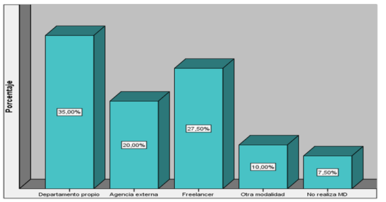 Como se puede observar, el Alfa Cronbach arrojó un resultado superior (,949), lo cual indica que la estructura del cuestionario se diseñó de manera coherente con los objetivos planteados para el desarrollo de esta investigación. Uno de los primeros aspectos consultados se relaciona con la inclusión en las áreas estratégicas de cada entidad sobre lo referente al marketing digital. A continuación, se presentan los indicadores de este aspecto (Figura 4).
