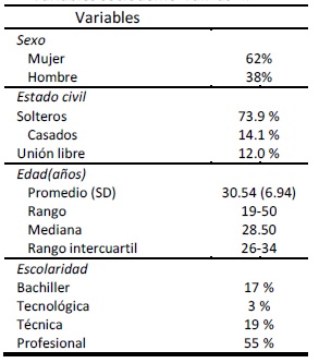 La edad promedio de los participantes del estudio fue de 30(±7) años, en su mayoría mujeres (62%). El estado civil más frecuente fue soltero (73%) (ver Tabla 1).