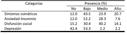 De entre las categorías del test de Goldberg, la categoría con mayor porcentaje de prevalencia en el nivel alto fueron síntomas somáticos (20.7%). En el nivel medio de intensidad se ubicó la disfunción social (40.2%) (ver tabla 3).