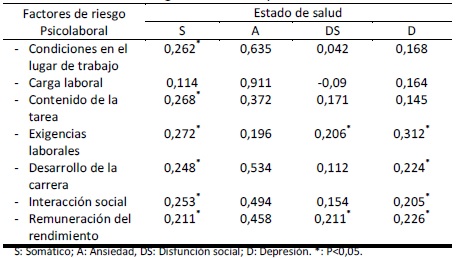 Resultados:Los factores psicosociales más prevalentes fueron: carga laboral (70.7%), remuneración del rendimiento (60.9%) yexigencia laboral (35.9%). En el estado de salud, encontramos: depresión (53.3%), disfunción social (40.2%) y síntomas somáticos (20.7%). Aunque la correlación entre factores de riesgo psicosocial y problemas de salud fue baja, si fue estadísticamente significativa (R=0,269; P<0,05).