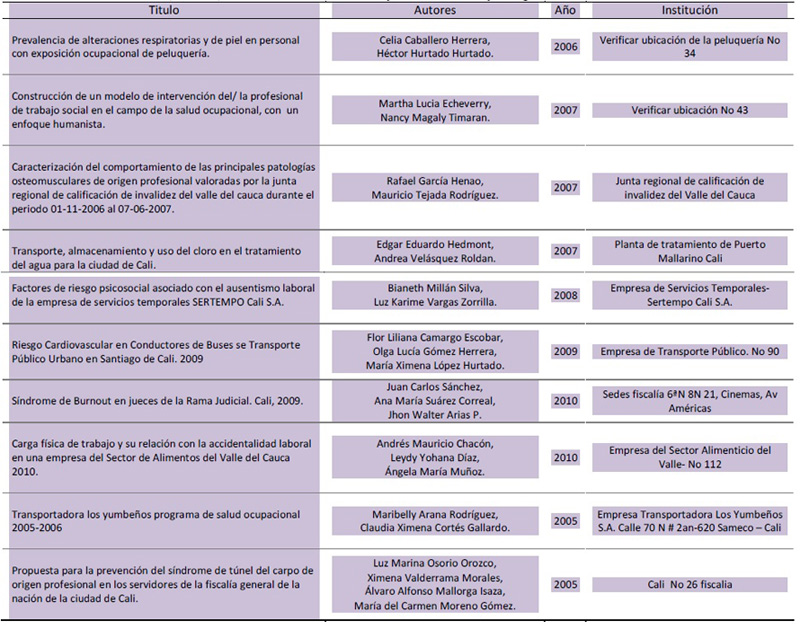 Cartografía Temática de las Investigaciones Realizadas por los Estudiantes de la Especialización en Salud Ocupacional, en el área Urbana de Cali, Colombia.