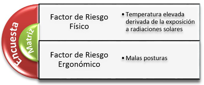 La figura 1 ilustra que tanto la encuesta de Condiciones de salud y trabajo y riesgos laborales del sector informal como la matriz de peligros (ICONTEC GTC 45) coinciden en identificar las altas temperaturas por exposición a radiaciones solares por un lado, y las malas posturas durante la labor por otro, como fuentes importantes de riesgo físico y ergonómico en el trabajo de mototaxista en el Municipio de Palmira.