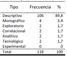De los 118 trabajos de grado, se observa que predominan los estudios de tipo descriptivo y no se presentaron trabajos de tipo experimental (ver Tabla 4).
