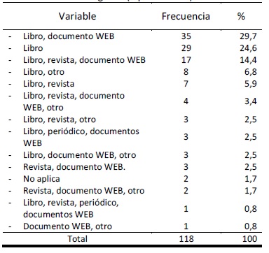 Los análisis determinaron que el tipo de información bibliográfica que más se consultó para el desarrollo de estos trabajos fue la combinación de libros y documento web, seguidos de solo libros (ver Tabla 5).