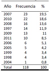El análisis de los 118 trabajos de grado permitió segmentar los resultados en 4 categorías. La primera fue año de entrega, donde se observó que en el periodo 2007-2010 fue donde se entregaron la mayoría (62,7%) de trabajos de grado (ver Tabla 1).