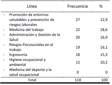 En la distribución de los trabajos de grado según la línea de investigación, se encontró que la mayoría de los trabajos se dedicaron a la de promoción de entornos saludables y prevención de riesgos laborales. La mayoría de las líneas estuvieron en un rango entre 10-18 estudios (ver Tabla 3).
