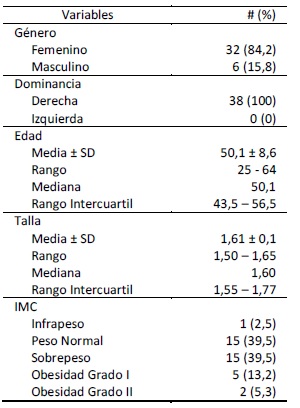 De los 38 docentes entrevistados, la mayoría fueron mujeres. El promedio de edad se ubicó en los 50 años y la talla en 1,60 m. Todos los participantes del estudio fueron de dominancia diestra. El 58% de los participantes se ubicaron en un IMC por encima del peso normal (ver Tabla 1).