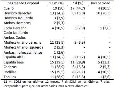 De acuerdo a la determinación de SOM, se encontró que en los docentes en los últimos 12 meses, el 50% de la población ha presentado sintomatología en cuello, seguido de espalda baja (39,5%). En los últimos 7 días la sintomatología se detecto en los mismos segmentos: cuello (44,7%) y espalda baja (28,9%) (ver Tabla 4).
