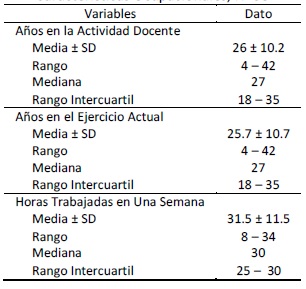 Respecto al tiempo de exposición laboral, en promedio los participantes se han dedicado 26 años al ejercicio docente, con un rango que va desde tan solo 4 años hasta mas de 40 años. Un fenómeno similar se observó respecto a los años en la ocupación actual. Finalmente, se observó que el promedio de horas trabajadas (docencia directa) en una semana se ubica a cerca a 30, independientemente de la actividad (ver Tabla 2).