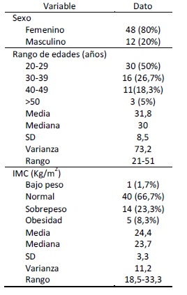 El estudio mostró un predominio del género femenino. La mitad de la población estudiada se ubicó en el rango de edad de 20-29 años. Respecto al IMC, la mayor parte de la población se clasificó como normal. Se identificaron 6 casos potencialmente patológicos, uno por bajo peso y 5 por obesidad (ver Tabla 1).