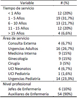 La mayor parte de la población lleva entre 1 y 5 años de servicio. Llama la atención que el 20% tiene más de 10 años de servicio. Las áreas con mayor representación de trabajadores en el estudio fueron las urgencias de pediatría y adultos (50%). El 90% de los trabajadores evaluados son auxiliares de enfermería (90%) (ver Tabla 2).