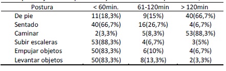 TABLA 3 Tiempo subjetivo de posturas y actividades ocupacionales; n=60