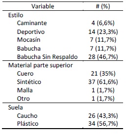 El peso de la mayor parte del calzado osciló en 100199 gr (48,3%). Solo el 8,3% estuvo por debajo de los 100 gr y el 10% por encima de los 300 gr. El 58,3% del calzado presentó un tacón que osciló entre 0 y 2,5 cm de altura. El patrón de desgaste del zapato fue en promedio 55%. Mientras que la percepción de ajuste del talón, anchura del zapato, espacio para los dedos, transpirabilidad, amortiguación y duración del calzado en su mayoría se clasificó como buena (53,3; 81,7; 95; 61,7; 76,7 y 66,7%, respectivamente); la percepción de seguridad se manifestó como mala en un 45% de los usuarios.