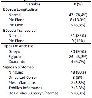 La presencia de dolor en los sujetos que lo reportaron fue predominante en la zona inferior del talón (15%) y en la planta del pie (11,7%). Los signos y síntomas detectados fueron dificultad para correr, pies y tobillos inflamados, con un importante número de personas que presentaron más de dos signos (8,3%). Aunque el 80% manifiesta no tener ningún tipo de síntoma, al examen clínico se encontró que realmente el 73.3% no tiene puntos dolorosos en el pie. La población no presentó ninguna deformidad en el pie.