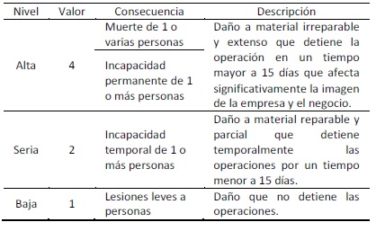 En esta carta se reporta un estudio descriptivo, de corte transversal en 46 trabajadores del área de operaciones de una empresa del sector industrial de la ciudad de Santander de Quilichao, Colombia. Esta área es considerada como de alto riesgo de accidentalidad e incluye tres salas de máquinas y un área de mantenimiento. Los participantes del estudio fueron seleccionados al azar, a partir de una base de datos de los trabajadores de la empresa. Se excluyeron trabajadores de otras áreas y aquellos que no accedieron a participar voluntariamente. La evaluación de la percepción del riesgo se realizó mediante el cuestionario desarrollado por Robaina et al (2003).6 Esta herramienta incluyo variables sociodemográficas y laborales como: género, edad, escolaridad, cargo, antigüedad, estado civil y jornada laboral. Contiene un componente de evaluación de la percepción del riesgo, la frecuencia de accidentes, los responsables y las causas. Al componente de percepción de riesgo se le analizó la frecuencia de respuestas positivas y se expresó como un porcentaje. Por otro lado, la valoración del riesgo se realizó con un instrumento diseñado internamente por la empresa, el cual permitió identificar las áreas de mayor riesgo de accidentalidad. La valoración del riesgo se hizo con base en los puntajes descritos en la Tabla 1 y posteriormente se adjudicó un valor a la consecuencia de los accidentes de cada área usando los valores de la Tabla 2.