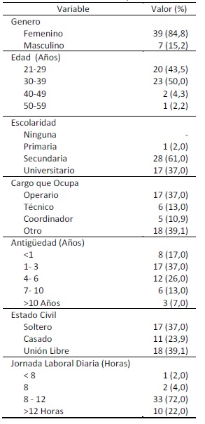 La mayoría de participantes en el estudio fueron mujeres. La mayor proporción de trabajadores estuvieron entre los 30 y 39 años de edad (ver Tabla 3). El nivel de escolaridad predominante fue media secundaria y una gran proporción tenían labores de operarios. Más del 50% de los trabajadores llevaban entre 1 y 6 años en sus labores. Es llamativo, que el 22% de los trabajadores tenían jornadas laborales entre 8 y 12 horas diarias (ver Tabla 3).