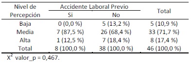 La tabla 4 muestra la relación entre nivel de percepción de los trabajadores acerca del riesgo de accidentarse según si habían tenido o no un accidente laboral para el año 2011. En general, el 89,1 % de los trabajadores tienen una percepción de riesgo media o alta. Sin embargo, aun cuando se esperaba una mayor percepción del riesgo en trabajadores que habían sufrido accidentes, los resultados no permitieron sustentar esta hipótesis y no fue posible establecer diferencias significativas con aquellos que no habían tenido accidente alguno.