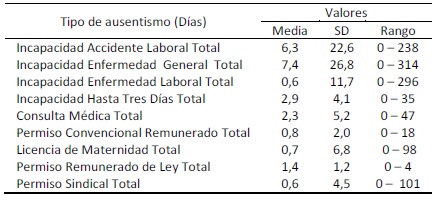 Resultados: La edad de la población estudiada fluctuó entre 18 y 61 años (X=44,7; SD: 10,0). La antigüedad promedio en la empresa fue de 16 años (SD: 10,5). La gran mayoría (93%) de los trabajadores fueron hombres. Se encontró mayor poder discriminante (92,3%¸ lambda de wilks 0,982, Valor_p=0,026) para el conjunto de variables: edad (años), antigüedad (años), consultas médicas (días), ausentismo remunerado (días), ausentismo causas médicas (días)