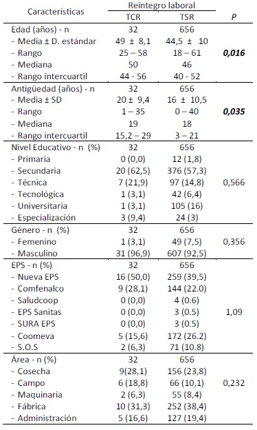 Al presentar los grupos en términos de la exposición o no a reintegro laboral, se encontró que las 32 personas del grupo de trabajadores con reintegro laboral (TCR) es de mayor edad en promedio que los que no tuvieron reintegro laboral (TSR) que fueron 656 en el período del estudio. La antigüedad en la empresa también fue significativamente mayor en el grupo TCR. La asociación entre variables de ausentismo y reintegro laboral presentó significancia estadística considerando alfa=0,05 y un intervalo de confianza (IC)=95 en las variables de Edad y antigüedad (ver Tabla 3). Las variables nivel educativo, género, servicio de salud (EPS) y área de trabajo en la empresa no mostraron diferencias significativas entre los dos grupos. Las áreas de fábrica y cosecha presentaron el mayor número de ausentistas de ambos grupos: TCR y TSR (Ver Tabla 3).