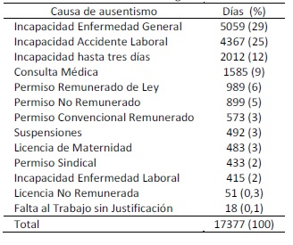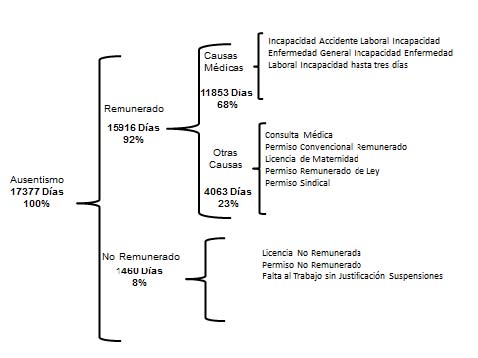 La Enfermedad General fue la principal causa de ausentismo (ver Tabla 1), seguido de incapacidad por accidente laboral. Las consultas médicas, con un 9% representaron 1585 días de ausentismo de trabajadores que según convención colectiva tienen 8 horas de permiso remunerado para consultas en la ciudad y 4 horas para consultas en poblaciones más cercanas a la empresa (ver Tabla 1). La mayor parte del ausentismo fue remunerado (92%) y el 8% no remunerado. El 68% del ausentismo total se debió a causas médicas y el 23% fue por otras causas (ver Figura 1).