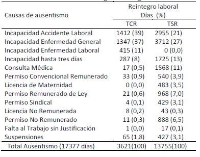 El ausentismo y el reintegro laboral son extremadamente importantes para las organizaciones y para las estrategias de intervención en responsabilidad social de le empresa, los trabajadores que tiene reintegro laboral se ausentan por causas médicas, pero si se compara su ausentismo en días es mucho más significativo los días de ausentismo de la población sin reintegro laboral, que además presenta más ausentismo por causas no médicas.