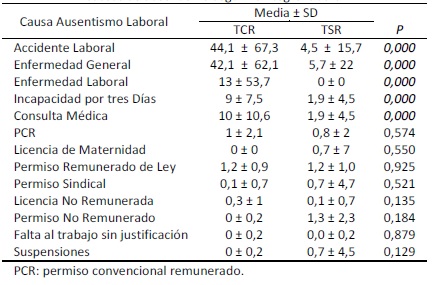 El ausentismo en el grupo TCR (3621 días) representó el 21% del total de ausentismo del período, en contraste con el 79% (13755 días) de ausentismo de TSR. El ausentismo por causas médicas representó más del 80% en TCR en contraste con el 4(% de estas variables en TSR. La incapacidad hasta tres días fue en cantidad de días mucho más alta en TSR al igual que la consulta médica (Ver Tabla 4).