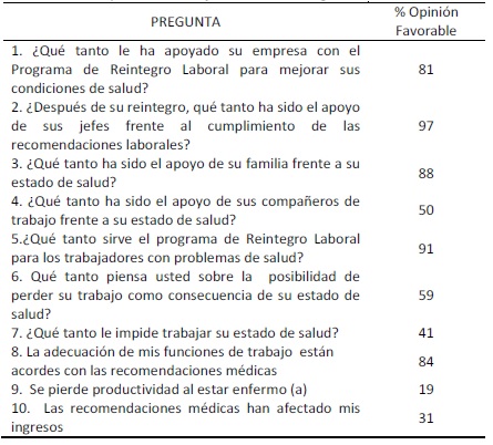 En la encuesta de opinión a los TCR se encontró una percepción positiva (81%) frente al apoyo recibido por la empresa. El 97% percibió con muy buena opinión el apoyo recibido de los jefes. El 88% de los trabajadores con reintegro consideró mucho y total al apoyo recibido de la familia, en contraste con el apoyo percibido de los compañeros de trabajo del 50%. El 91% opinó que el Programa de Reintegro Laboral les sirve a los trabajadores con problemas de salud. El 59% evidenció que piensa mucho sobre la posible pérdida de su trabajo por su condición de salud. El 41% pensó que su estado de salud le impide trabajar. El 84% está de acuerdo con la adaptación de funciones a su estado de salud, solo el 19% estuvo de acuerdo con la afirmación de que se pierde productividad al estar enfermo y el 31% de los encuestados expresó que las recomendaciones médicas habían afectado sus ingresos (Ver tabla 7).