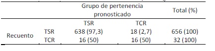 Manejo y análisis de los datos: Se construyó una base de datos en Microsoft®Excel, que posteriormente se importó a SPSS v13.0 (SPSS Inc.; Chicago, IL). Para las variables continuas se calcularon desviaciones estándar, media y rango intercuartil. Para las variables cualitativas se calcularon proporciones8. Se realizó análisis de regresión logística bivariado en el cual se tuvieron en cuenta las variables cuyos coeficientes presentaron un nivel de significancia estadística menor de 0,05 (p<0,05), se realizó además análisis discriminante para determinar el coeficiente de regresión del conjunto de variables frente al RL.9