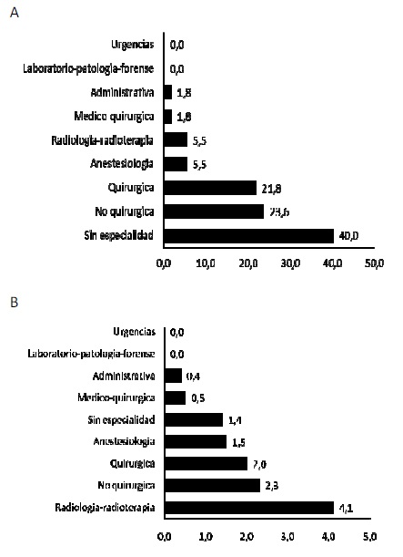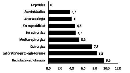 | Radiología-Radioterapia | 7 | 3,9 | 73 | 10,4 |