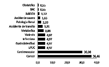 La Figura 2 muestra que las principales causas de muerte en médicos en la ciudad de Cali. Durante el período estudiado fueron las relacionadas con Cáncer y causas Cardiovasculares. Entre estas dos concentraron el 66,8% de las causas de muerte.