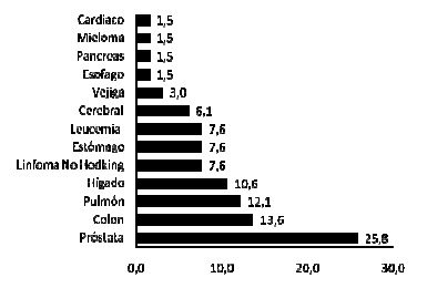 La Figura 3 muestra que el tipo de Cáncer más frecuente como causa de muerte en los casos estudiados fue el de Próstata, seguido del Cáncer de Colon y Pulmón.