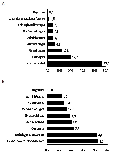 En la figura 5-A se observa que el grupo de los médicos sin especialidad fueron los que más porcentaje de fallecimientos por causas cardiovasculares aportaron, mientras que en el grupo de especialidades de tipo Laboratorio-Patología-Forense y urgencias no se presentaron muertes por causas cardiovasculares. En la Figura 5-B se observa que la TMP por causa Cardiovascular más alta se presentó en las especialidades tipo Radiología-radioterapia y la más baja en las especialidades de tipo administrativas. No se observa una diferencia estadísticamente significativa entre los fallecimientos por causas Cardiovasculares en las diferentes especialidades.