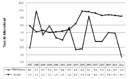 En la figura 6 se muestran las tendencias de la TMP de médicos vs la población general de la ciudad de Cali (> 30 años de edad). La TMP para los médicos, en el periodo desde el año 1997 al año 2011 fue de 5,8 por cada 1.000 personas, mientras para la población general de la ciudad de Cali (> 30 años de edad) la TMP calculada fue de 8,3 por cada 1.000 habitantes. Las diferencias en las TMP fueron estadísticamente significativas (P<0.001)