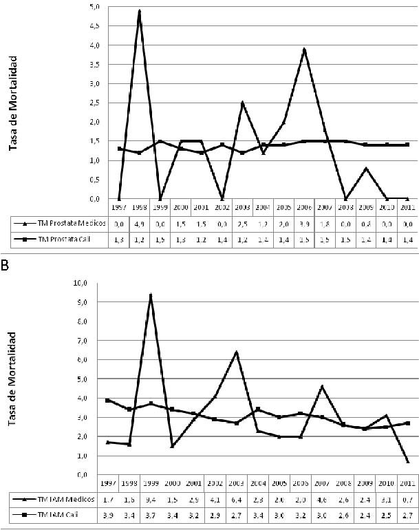 En la figura 7-B se observa que la TMP por IAM de la población médica masculina fue de 3,0 al igual que la TMP calculada para la población masculina general de la ciudad de Cali (> 45 años de edad).