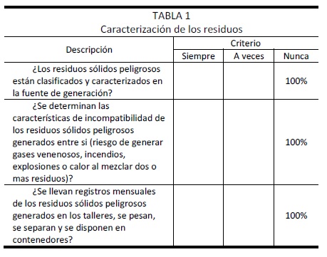 Introduction: The hazardous solid waste generated in the workshops of vehicle maintenance, is subject of interest to entrepreneurs and environmental authorities, since non-proper management of these wastes affect health and the environment. The aim was to characterize the hazardous solid waste management in a mass transportation company in Cali (Colombia) in addition to the knowledge of such management by mechanics.