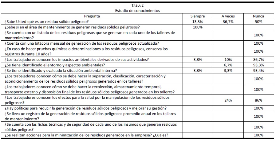Estudio de conocimientos: se aplicó una encuesta a 30 mecánicos distribuidos en los todos los turnos programados en la empresa, elaborada por los investigadores donde se recogieron los nueve pasos, con el fin de determinar el grado de conocimiento sobre la generación, identificación, separación, envasado, almacenamiento, acopio, recolección, transporte y disposición final.13 Se evaluó el conocimiento de los mecánicos con la aplicación de la encuesta donde se les preguntó sobre cada paso del manejo de los residuos peligrosos y la observación directa en cada actividad realizada por ellos.
