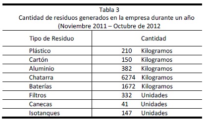 Tabla 3. Cantidad de residuos generados en la empresa durante un año (Noviembre 2011 – Octubre de 2012